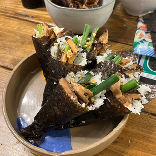 I made 3 cups of sushi rice, which can be made in the morning to let cool before use in the crispy rice and handrolls. Other items for cooking will be tofu (spring rolls) and shiitakes (handrolls). Otherwise, tasks will be chopping veggies, making peanut sauce, and assembly. Leave more time than you think needed for assembly as these are all very hands-on recipes!