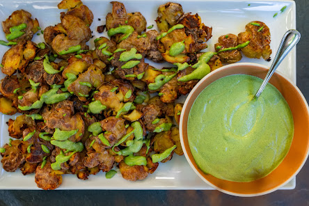 Crispy smashed potatoes with green goddess dressing (from Big Vegan Flavor, Nisha Vora)